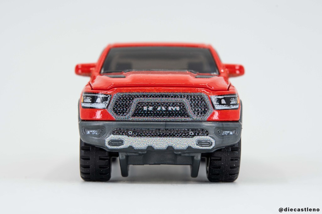 What’s under the Matchbox’s hood is perhaps the most interesting part of this model. There’s a reasonable amount of detailing in the engine bay, with the valve covers featuring the “Rebel” logo on each side. Bizarrely, the real Rebel’s engine does not feature those logos on the valve cover. Even weirder: the engine in this model is not the standard Ram Rebel engine. At the top of the engine is quite clearly Stellantis’s trademark supercharger from the Hellcat engine, which made me originally identify this model as a Ram TRX when the first sneaks appeared on the Matchbox Instagram. I can only speculate as to what happened here, but I can’t help but wonder if the Matchbox team originally set out to design a TRX but ran into a licensing issue. Or, perhaps the designer just wanted to include the Hellcat engine as an Easter egg for collectors to find.