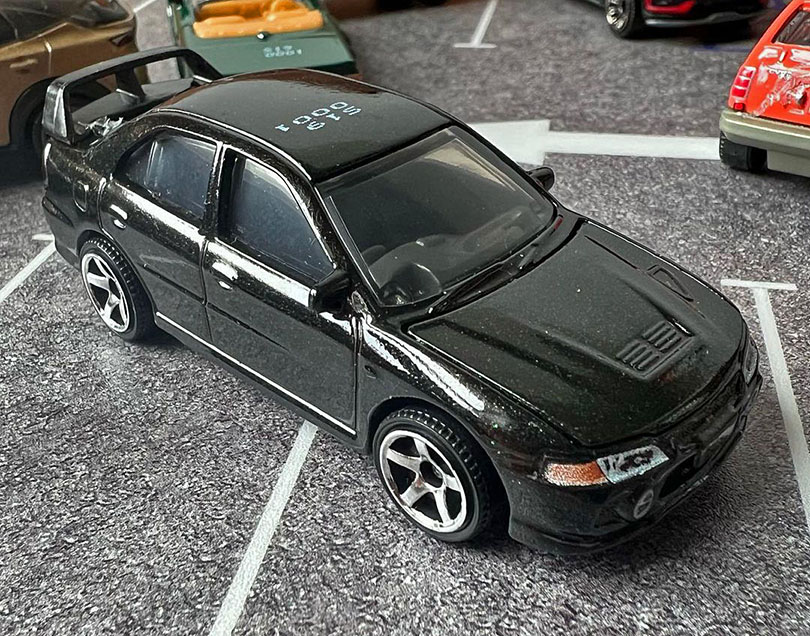 Perhaps the more exciting opening hood is on this Evo, freshly recolored in black and looking good! I love these silver 5 spoke wheels, as they seem to fit the character of the car much better than the gold ten spokes that the Evo debuted with. The color match on the black plastic of the spoiler looks decent, though obviously it lacks the metal flake of the rest of the car. I’m thrilled to see this Evo getting so much use in the Moving Parts line, and I hope we continue to get more clean releases!