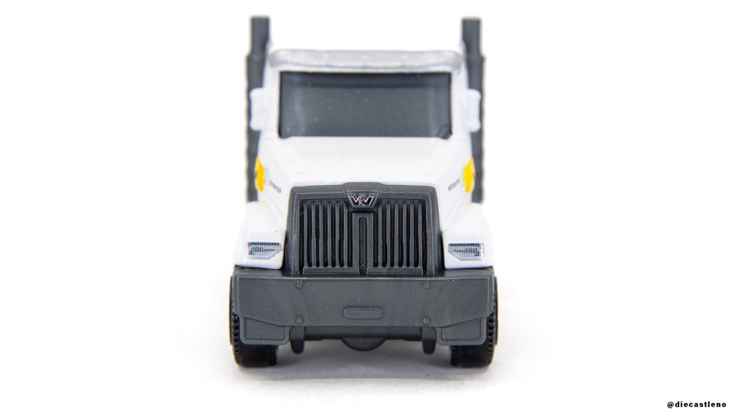 The front of the truck is dominated by that distinctive and imposing vertical-slat grill, complete with a printed Western Star logo at the top. Flanking the grill are printed headlights that are missing the 49X’s orange LED strip, but they’re still a very welcome sight. Matchbox even printed the silver trim piece above the windshield!