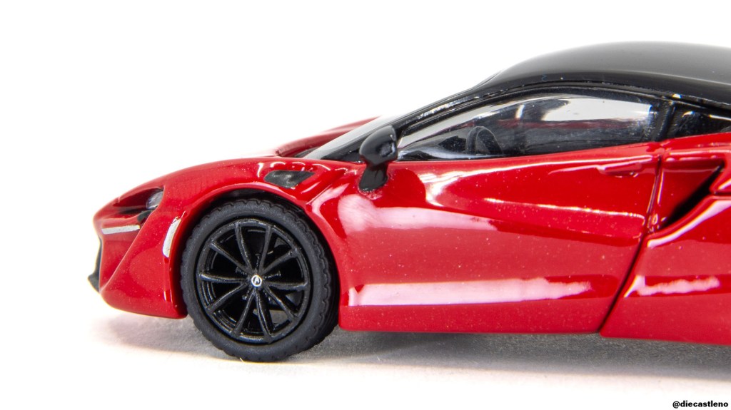 Luckily, the Artura makes up for its boring engine cover by looking absolutely stunning elsewhere. While this casting has a bit of an ugly panel gap behind the doors, I find the Artura to be the best version of McLaren’s modern design language, with classic supercar proportions from the side. I can’t help but see a bit of Lotus Emira in that side intake, which is certainly no criticism. I appreciate the McLaren logos on the center caps, and the McLaren’s side mirrors are gloss black rather than matte – unusual for a MiniGT.