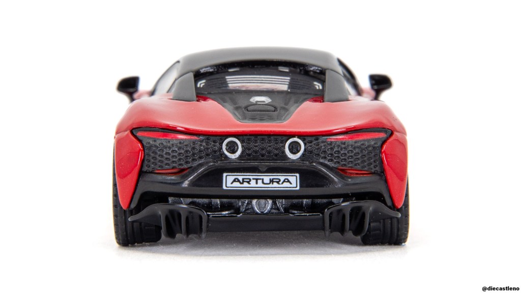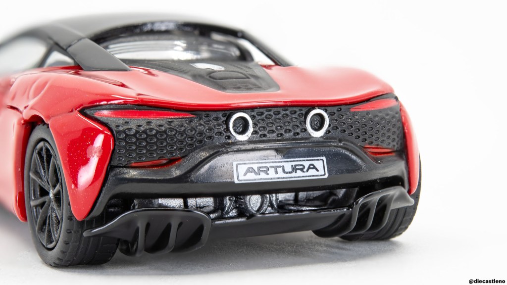 MiniGT did an excellent job on the front of the Artura as well. Look how deep the intakes beneath the headlights go, and how well they’ve captured the recessed headlight lenses. There’s even a tiny McLaren logo on the hood, though it lacks the texture of the logo on LCD’s 600LT. The black printing on the lower fascia does look a tad cheap, but not horribly so.