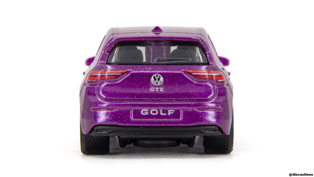 I love how the VW badge at the back sticks out from the bodywork – it makes the badge pop out and look far more realistic than if it was just printed on the flat hatch. The brake lights look good, though they aren’t nearly as detailed as the headlights, and I love the little spoiler on the rear hatch. Unfortunately, the purple paint color makes the interior support post clearly visible through the rear window, but that’s unavoidable with modern Matchbox castings.