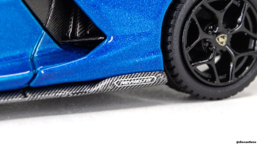 The rear of the Revuelto features similarly impressive brake light detailing, as well as silver detailing on the exhaust tips, which really makes them pop! I’m surprised to see the silver exhaust tips, given that the Revuelto is also available with black exhaust tips that would have allowed MiniGT to skip that bit of detailing – though I’m glad they didn’t! The rear diffuser features carbon fiber detailing and a little Lamborghini logo below the exhaust tips, though it’s a little disappointing to see that the carbon fiber weave doesn’t maintain a consistent direction or come to a point in the center, as it does on the 1:1 Revuelto.