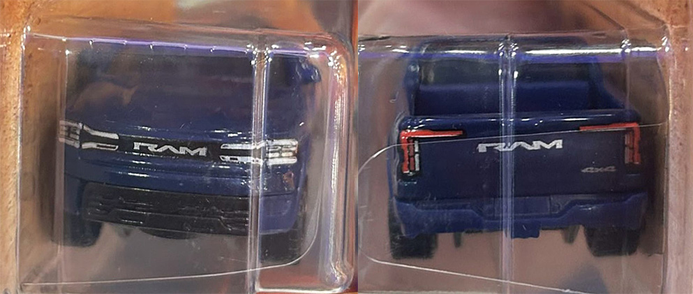 From these pictures, we can see that this model will have full front and rear detailing, including the REV’s distinctive lit Ram logo and futuristic daytime running lights. I appreciate the use of the black base section to form the truck’s lower grille. This dark blue color is a bit more saturated than the grayish-blue used in Ram’s press images for the REV, but I think this is actually a more interesting color!