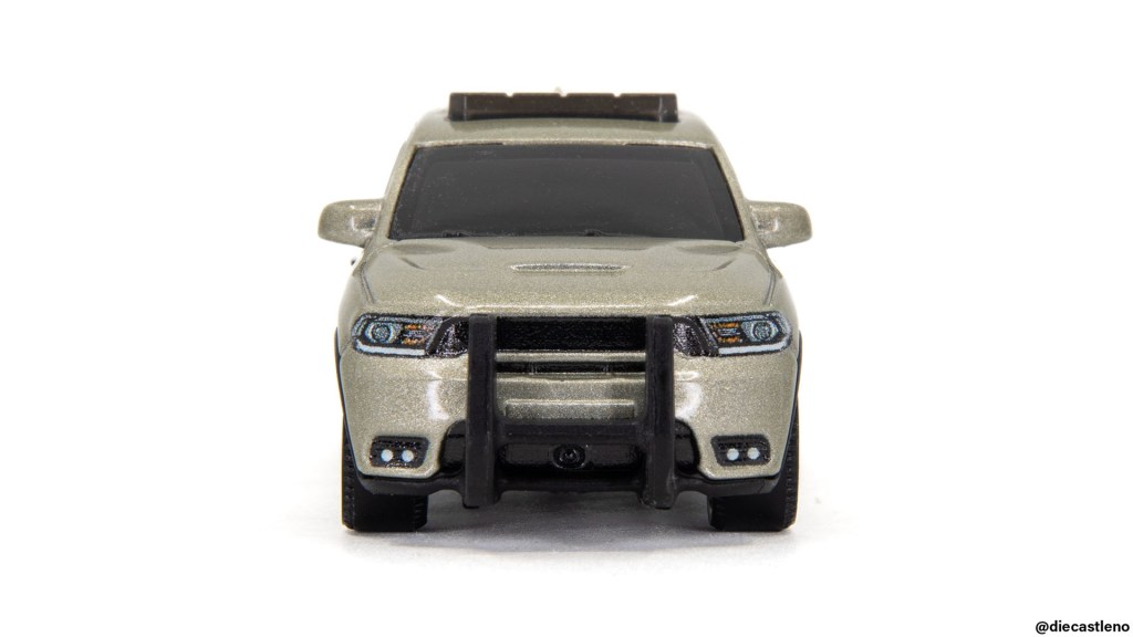 This Durango also receives full printed detailing in the front, a rarity among Matchbox police cars and a very welcome sight. The headlights are nicely detailed and you can even make out the turn signals within them! There is one thing that’s bugging me about this front end though…this isn’t a police Durango! The Durangos used by law enforcement are a model called the Dodge Durango Pursuit made by Dodge Law, but this casting appears to be based on the civilian Durango SRT. This is most obvious in the hood design (that hood scoop is clearly from an SRT model), but there are other differences as well. Those dual fog lights were a feature on the SRT Durango, and I don’t think I’ve ever seen them used on a police cruiser. Likewise, the radar cruise control sensor on the lower grille seems unlikely to appear on a police car. Suddenly I wish this Durango had an opening hood, because I suspect you’d find a 392 V8 under there!