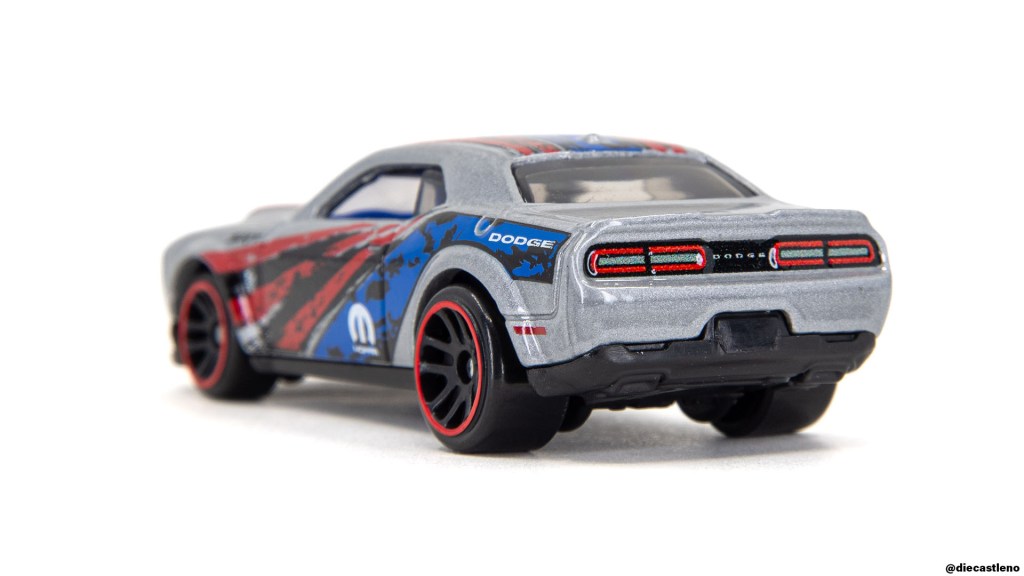 Ahh, much better! This model finally looks how it always deserved to. The front end really pops with this new detailing, and the giant air intake on the hood stands out much more now that the front end is no longer monochromatic. With its newfound clean silver paint, the Challenger’s distinctive quarter panel kink stands out, as do its massively flared wheel arches.