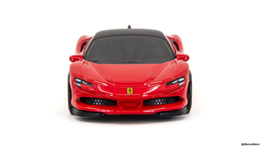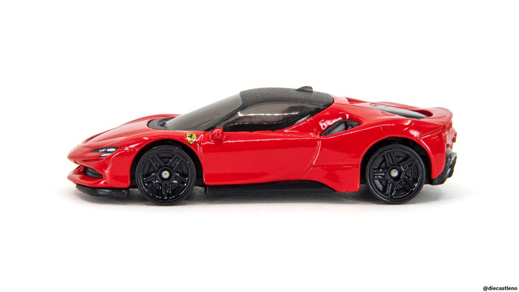 Let’s start with the good. Hot Wheels castings have come a long way in the last 10 years, and this SF90 does a great job of showing off that progress. The bodylines are crisp and sharp, especially on the hood, and it even has side mirrors (something you definitely couldn’t take for granted on old Hot Wheels Ferraris). The wheel fitment is excellent, with minimal wheel gap and an appropriately supercar-low ride height.
