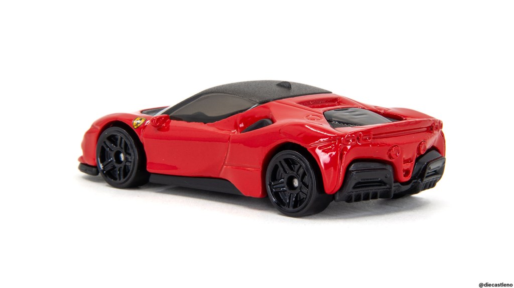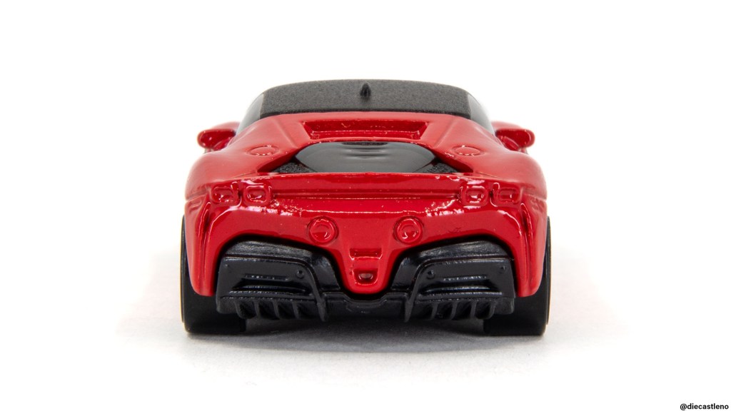 Unfortunately, as is typical for a mainline Ferrari from Hot Wheels, this SF90 lacks any printed detailing on the rear. Presumably at Ferrari’s insistence, Hot Wheels always includes the Ferrari shields on the fenders, as well as a Ferrari badge on the hood. Once all those badges are accounted for, there seems to be no budget left for brake lights or any other rear detailing, which always leaves the models feeling a bit incomplete. At least the casting detail at the rear is well executed, with clearly defined shapes for both the brake lights and the exhaust tips. The base is once again used to allow the SF90’s massive rear diffuser to be black without needing printed detailing, which helps distract from the car’s lack of brake lights.