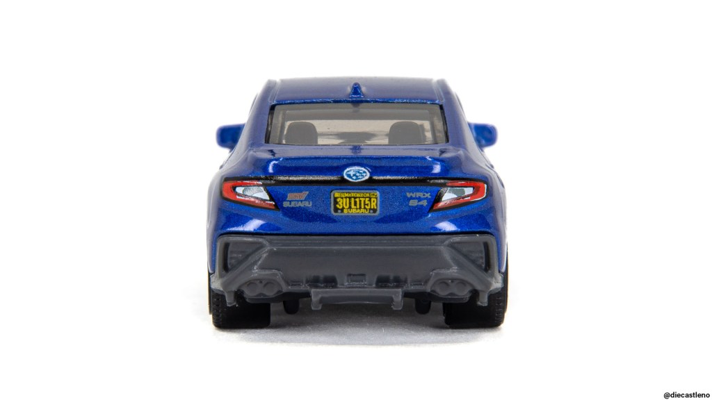 The rear of this model features every badge you could possibly want, plus a few more for your friends! There’s another raised Subaru badge, alongside “STI”, “Subaru”, “WRX”, and “S4” badges – gotta make sure everyone knows exactly which trim level they’re looking at. I have to give Matchbox credit for including one of the most detailed license plates I’ve ever seen on one of their models though. In typical Matchbox fashion, the plate features a coded message (it decodes to “C U LATER” in case you’re curious). Sadly, there wasn’t much Matchbox could do about the WRX’s unfortunate rear bumper situation. Oddly, it looks like Matchbox actually added another little diffuser section at the bottom of the bumper. I can’t find any pictures of a WRX with this diffuser online, so perhaps they added it to hide the rivet?