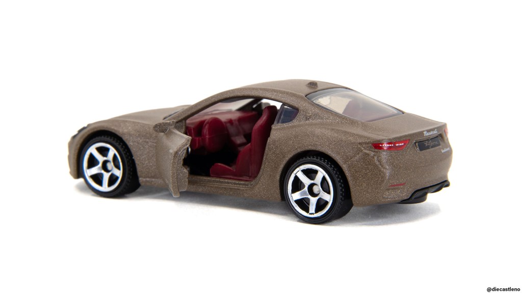 Even ignoring the opening doors, the sides are easily the weakest part of this model. Despite the higher detailing budget of the Moving Parts line, Matchbox has neglected to include any printed detailing on the sides of this model, so it missed out on critical styling details like the fender vents and the Maserati badge on the quarter panel. The look of the fender vents may have been cheapened a bit by their use on the Buick LaCrosse, but I still associate them with Maserati. Both the vents and badge are molded into the casting, but without printed detailing to make them contrast the brown paint, the side of the Granturismo just feels plain. Ironically, because of the lack of detailing, this Granturimo is also missing its Folgore badge that would normally sit prominently on the fender!